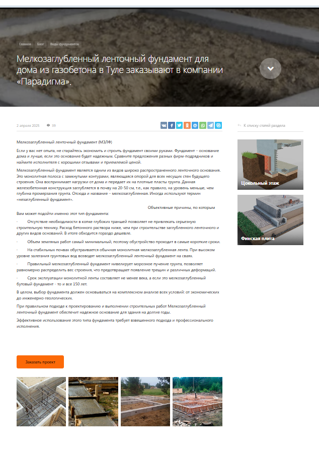 —Разработка сайта для компании "Парадигма- Строительство фундаментов, каркасных домов и модульных бань под ключ в Туле"
